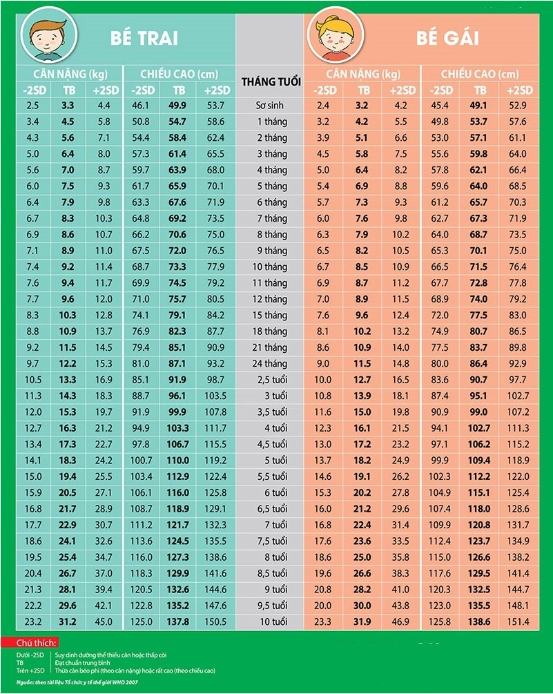 - Dưới -2SD: Trẻ đang suy dinh dưỡng thể nhẹ cân và thấp còi