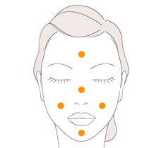 Sau khi sử dụng nước hoa hồng, kem nám tàn nhang transino whitening essence, bạn hãy dùng kem dưỡng trắng da ban đêm Transino Whitening Repair Cream bằng cách chấm 5 điểm trên khuôn mặt như dưới hình.